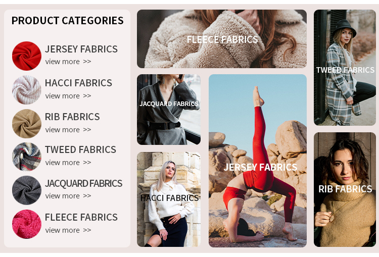 A: Knitting fabrics, such as jacquard, loose knit, other basic knits, women's fabrics, such as lace, embroidery, mesh and craft fabrics, etc.