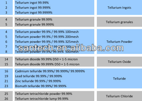 There are various kinds of tellurium products with different purity, shape and particle size: