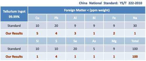 4N tellurium is produced according to Chinese national standard YS/T 222-2010. All of our test results were better than the norm. The purity is over 99.99%.