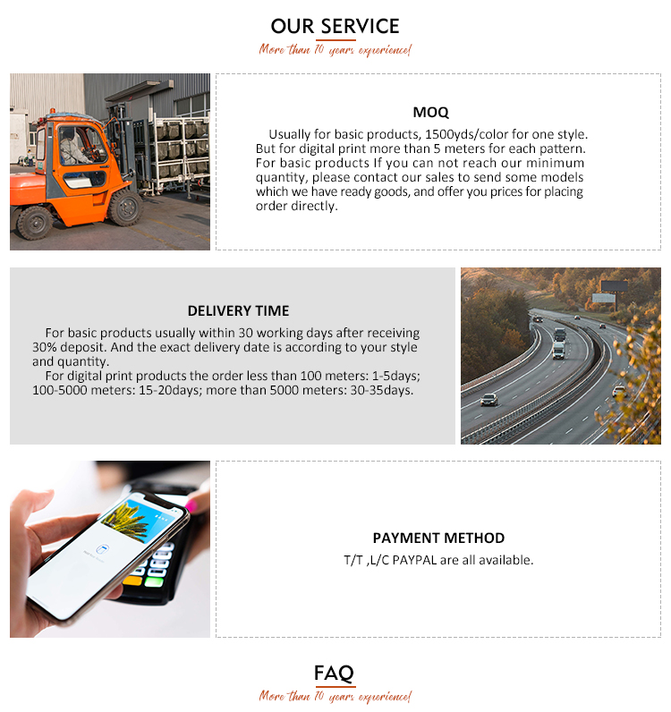 A: Usually for basic products, 1500 yards/color for one style. But for digital printing over 5 meters
