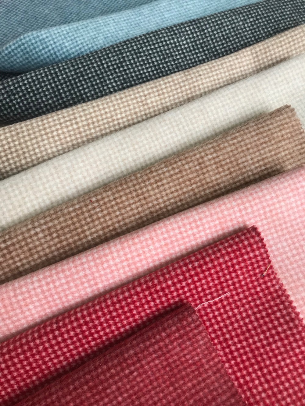 Our main products are melton fabrics, single and double coated wool fabrics. For melton fabrics, black, navy, dark blue, scarlet and royal blue are the most popular colors. Beige, caramel, grey, black and navy are also more preferred for coated wool fabrics.