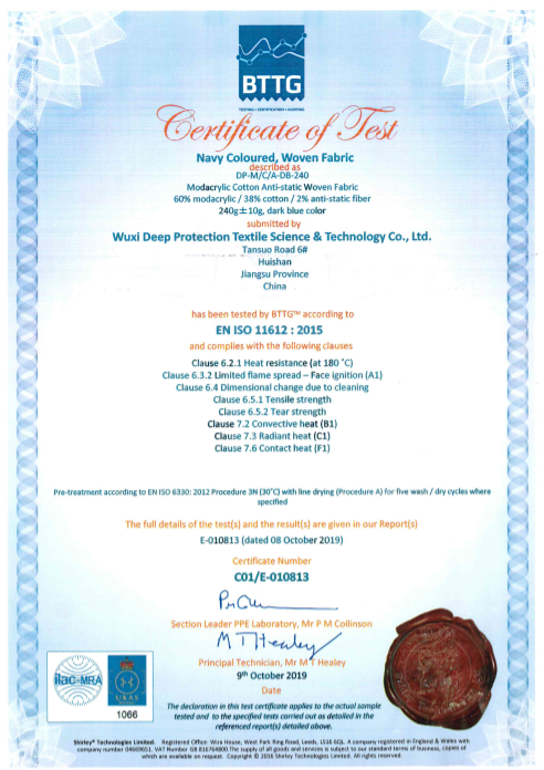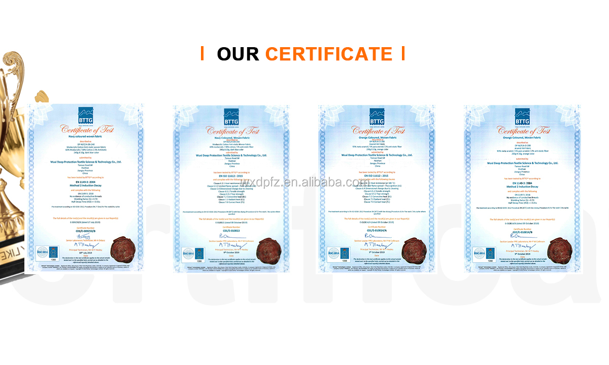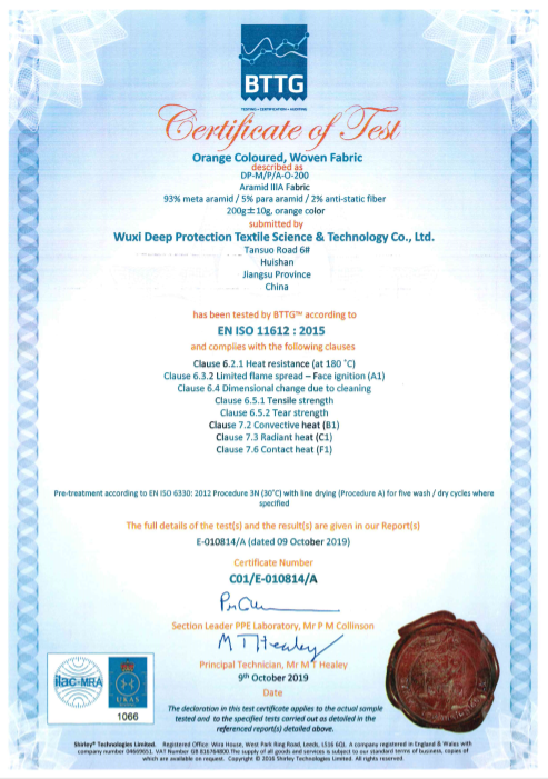 EN11612/11611, EN14116, EN469 NFPA1971, NFPA2112, ASTMF-1959, GB8965-2009, GA10-2014 |