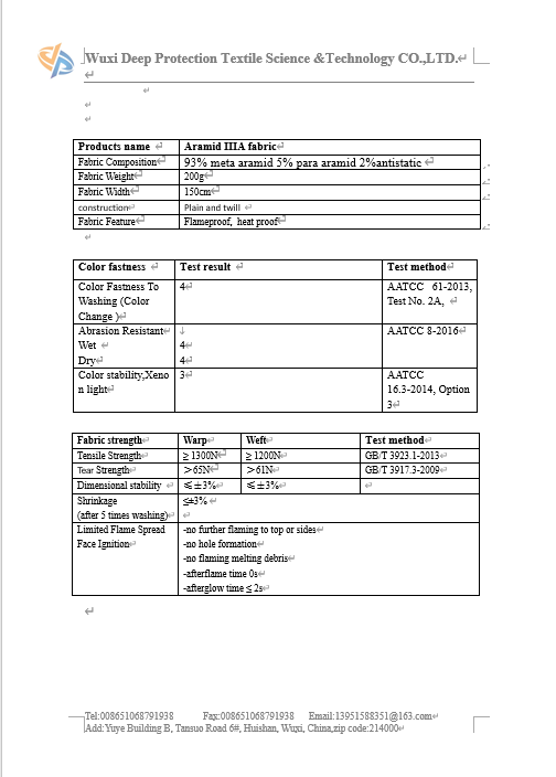 Wuxi Shenbao Textile Technology Co., Ltd. is a manufacturer specializing in the research, development and production of flame-retardant textile yarns and fabrics made of meta-aramid, para-aramid, modified acrylic, cotton, flame-retardant viscose and other materials. Our advanced equipment, innovative technology and professional experience create excellent quality. After testing by SGS and ITS, our products comply with domestic and foreign standards such as EN11612/11611, EN14116, NFPA1971, NFPA2112, ASTMF-1959, GB8965-2009, etc. GA10-2014 etc.