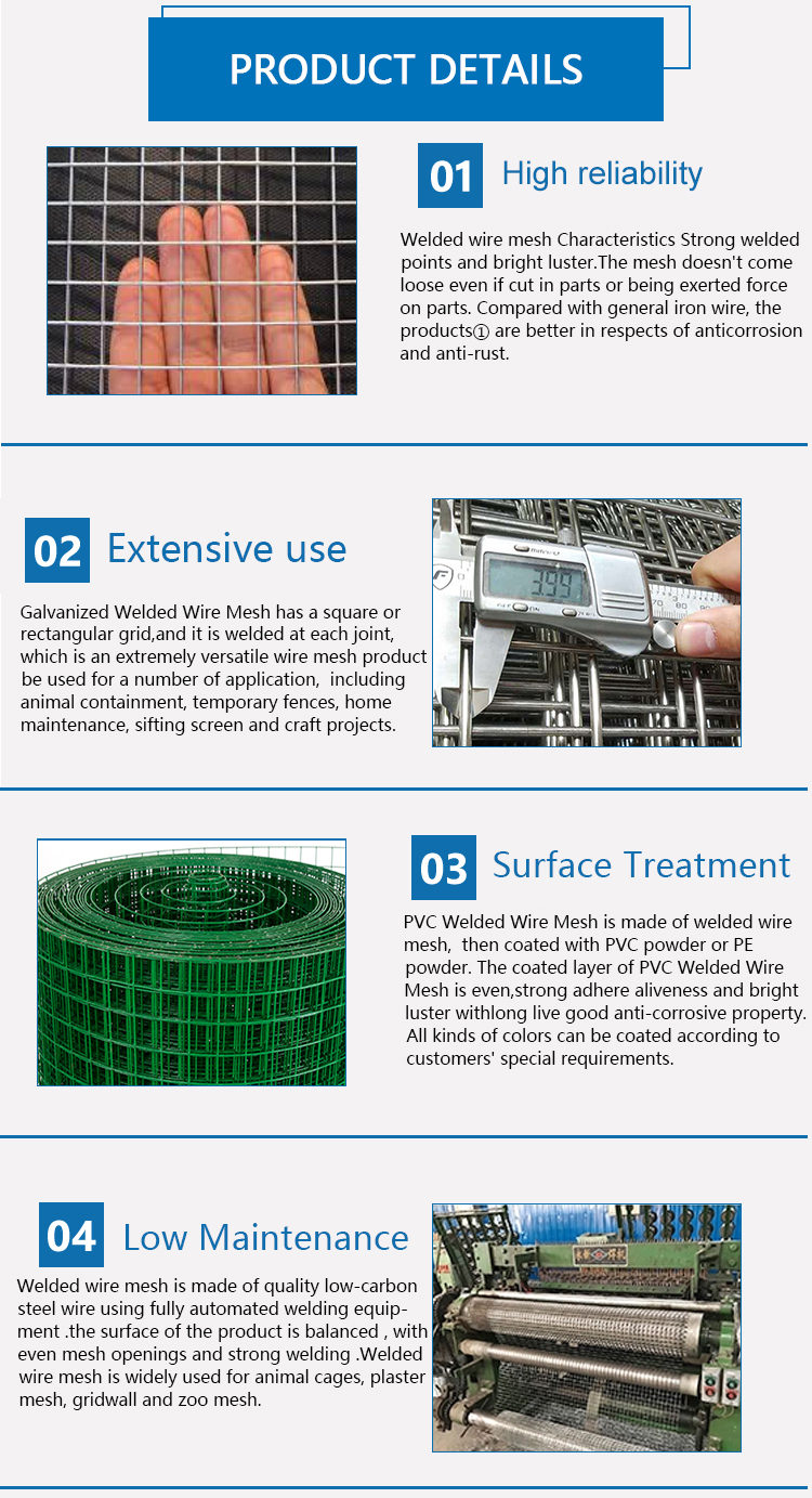 Hole shape: square Welded mesh 4: Stainless Steel Wire Mesh Manufacturers brand: strong off payment terms: L/C, Western Union, T/T Welded mesh 5: Welded Mesh Supplier PVC welded mesh color: green, gray, black Material: low carbon iron wire Hot-dip galvanized welded mesh: 40---250g/square meter...... -