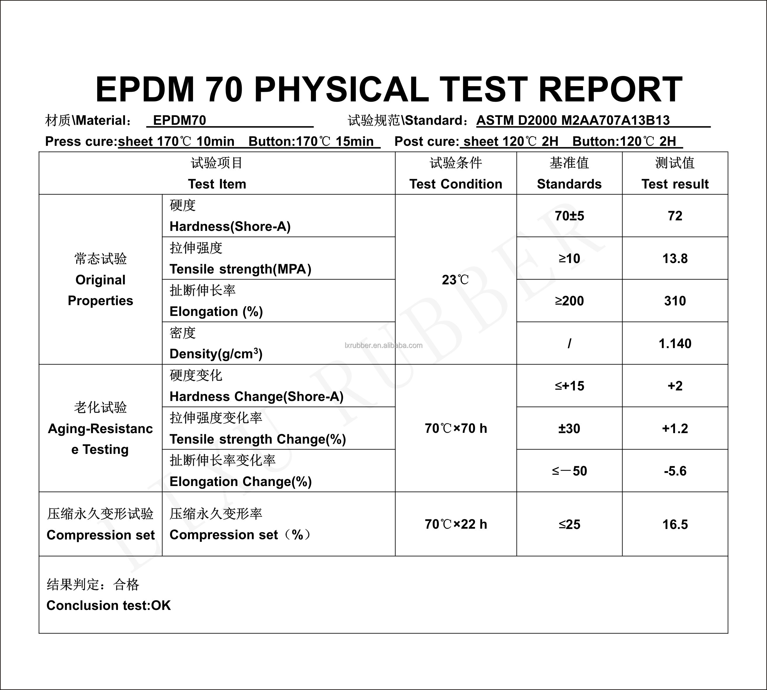| Compression set 22 hours 100C: | 11% | application: | Suitable for all industries |