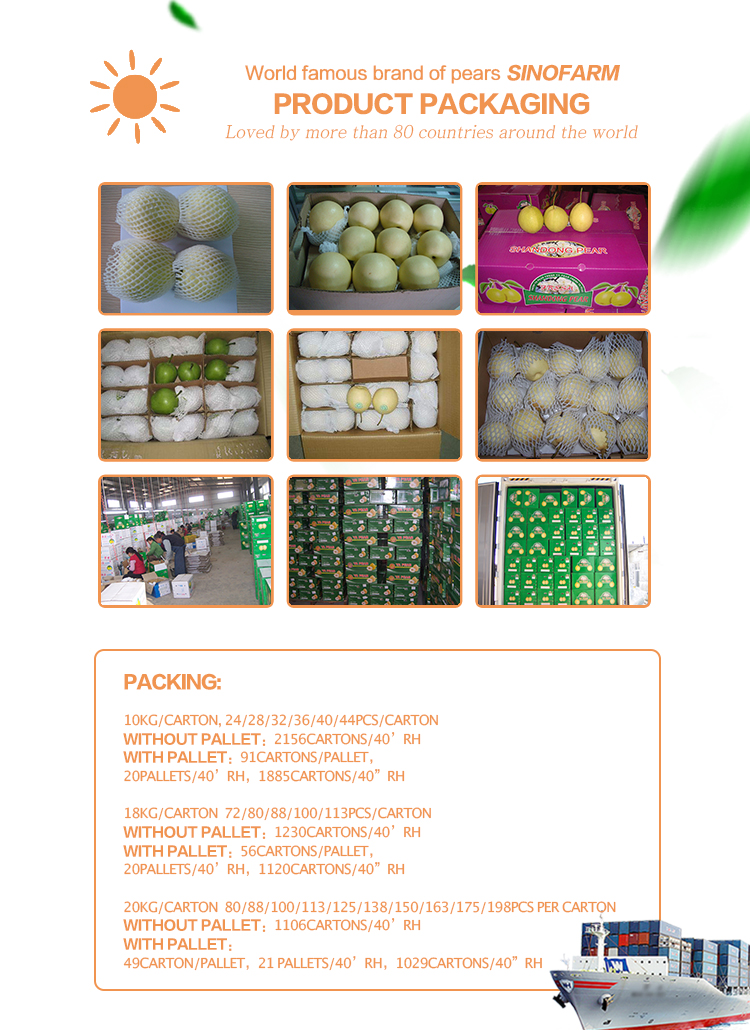 raw material: No Packaging Details: 10kg/15kg/18kg/20kg per carton Instructions for use: ready to eat Product Category: pome fruit product name: fresh pear storage type: cold storage crops: latest crop grade: A manufacturer: Huanong MOQ: 1x40 hours brand: Huanong taste: sweet and juicy style: fresh.... -