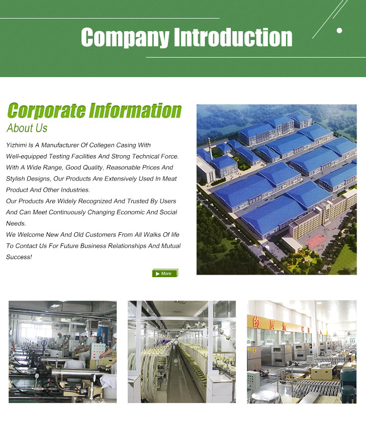 | Benefits of collagen casings: 1. Good taste, high transparency and simple production process. 2. Good air and moisture permeability. During smoking or cooking, collagen casings often allow gas to penetrate into the water, but the gas will not dissipate in the water. Due to its special structure, it can fully absorb smoked spices and other substances into the sausage, and can well preserve its fragrance. 3. Good thermal stability. The protein casing always keeps the size of the product consistent during cooling and storage, and no air bubbles will appear, thus ensuring product quality. 4. Good elasticity. 5. Beautiful, the protein casing shrinks naturally to ensure that the sausage is smooth and beautiful. |