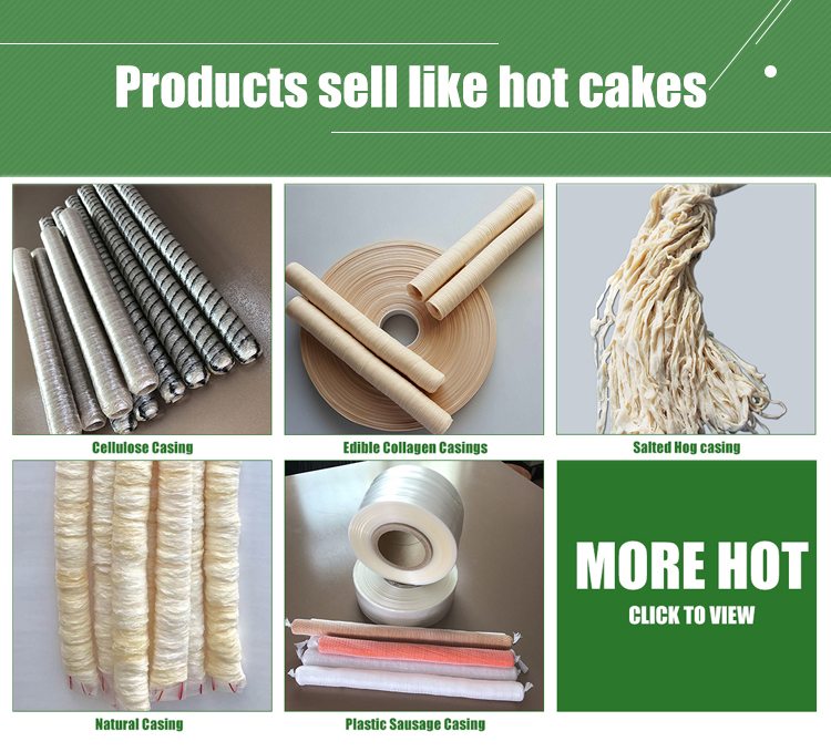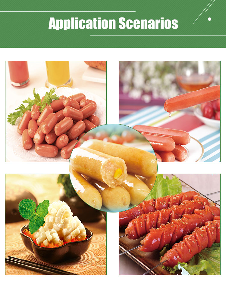 | Collagen casing uses: 1. Chinese sausage. 2. Smoked cooking sausages, such as frankfurters and Vienna sausages. 3. Sausages that need to be fried, such as breakfast sausage, Taiwanese sausage, and salami fermented sausage. |