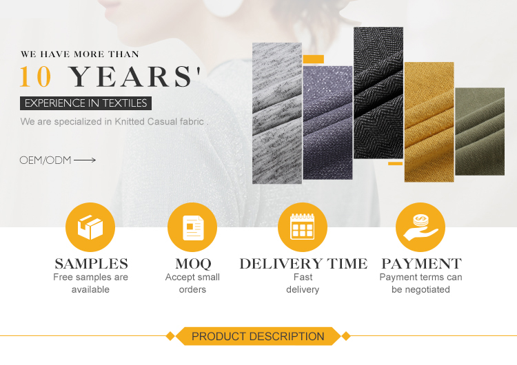 Key words: Lurex fabric Supply capacity: 10000 meters per month density: 45*35 type: D pattern: flat dyeing payment terms: L/C, Western Union, D/P, D/A, T/T, MoneyGram design: Accept custom design thickness: medium weight Yarn count: 20/22 days Origin: Jiangsu, China width: 43/44" supply type: Made.... -