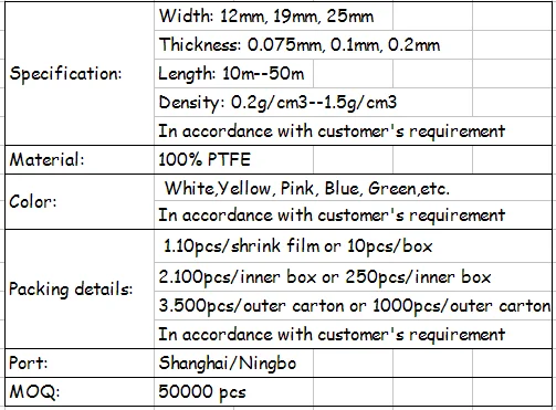 Origin: Fujian China payment terms: L/C, T/T color: white/custom type: tape model: PTFE tape product name: PTFE tape width: 12mm/customized Package: carton Material: PTFE MOQ: 10000 Serve: Design Manufacturer/OEM brand: UNIQUE Stretchability: 50%~400% application: hose, faucet Click here for more...... -