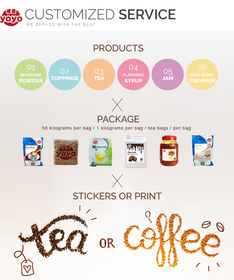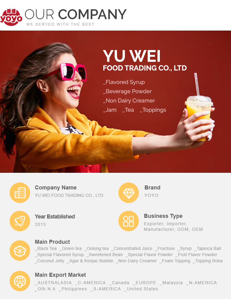 Founded in 2015, it is located in the middle of Xizhou, Changhua, Taiwan. We are specialized in supplying all kinds of tea making materials. Our main products include pearl milk tea, black tea, green tea, oolong tea, fruit tea, milk tea, Taiwanese tea, various tea bags, various instant powders, milk powder, various tapioca balls, concentrated syrup, syrup, canned food, sauces , Taiwanese specialty snack powder, pearl milk tea equipment.