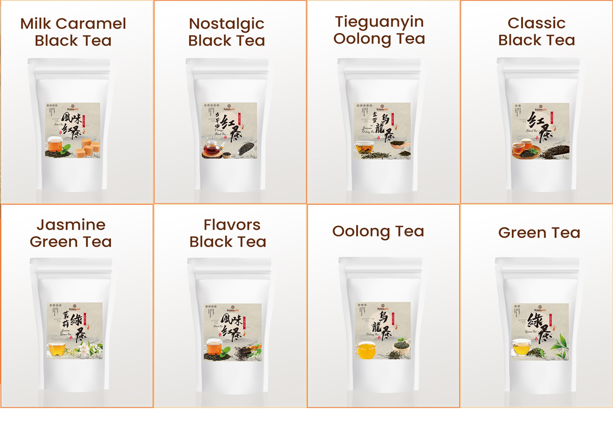 | Product taste | Mlik Caramel Black Tea, Nostalgic Black Tea, Tieguanyin Oolong Tea, Classic Black Tea, Jasmine Green Tea, Flavored Black Tea, Oolong Tea, Green Tea |