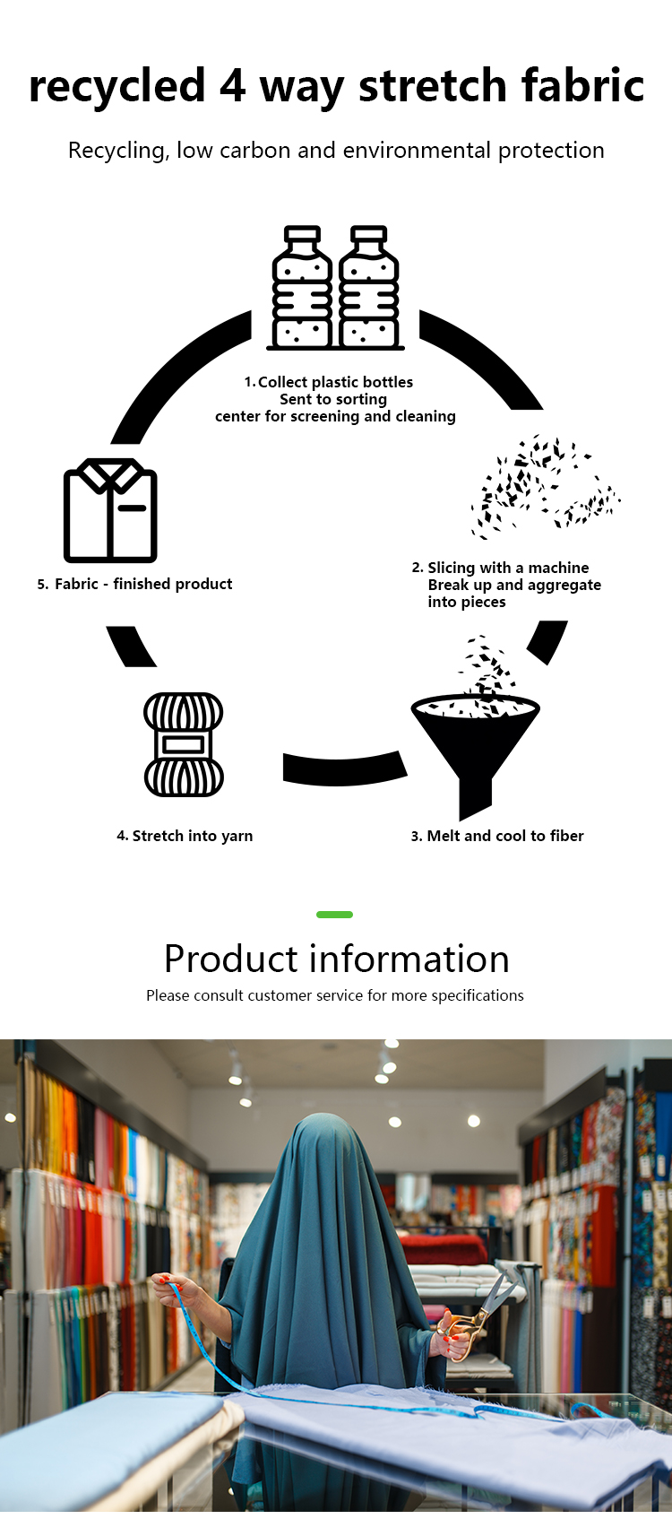 port: Shanghai Port, Ningbo Port Material: 100% recycled chiffon, 100% polyester Fabric processing: Accept custom fabric MOQ: 3 meters color: stock color/custom color Supply capacity: 500,000 meters per month Package preview: product name: Recycled polyester chiffon fabric Certification:...... -