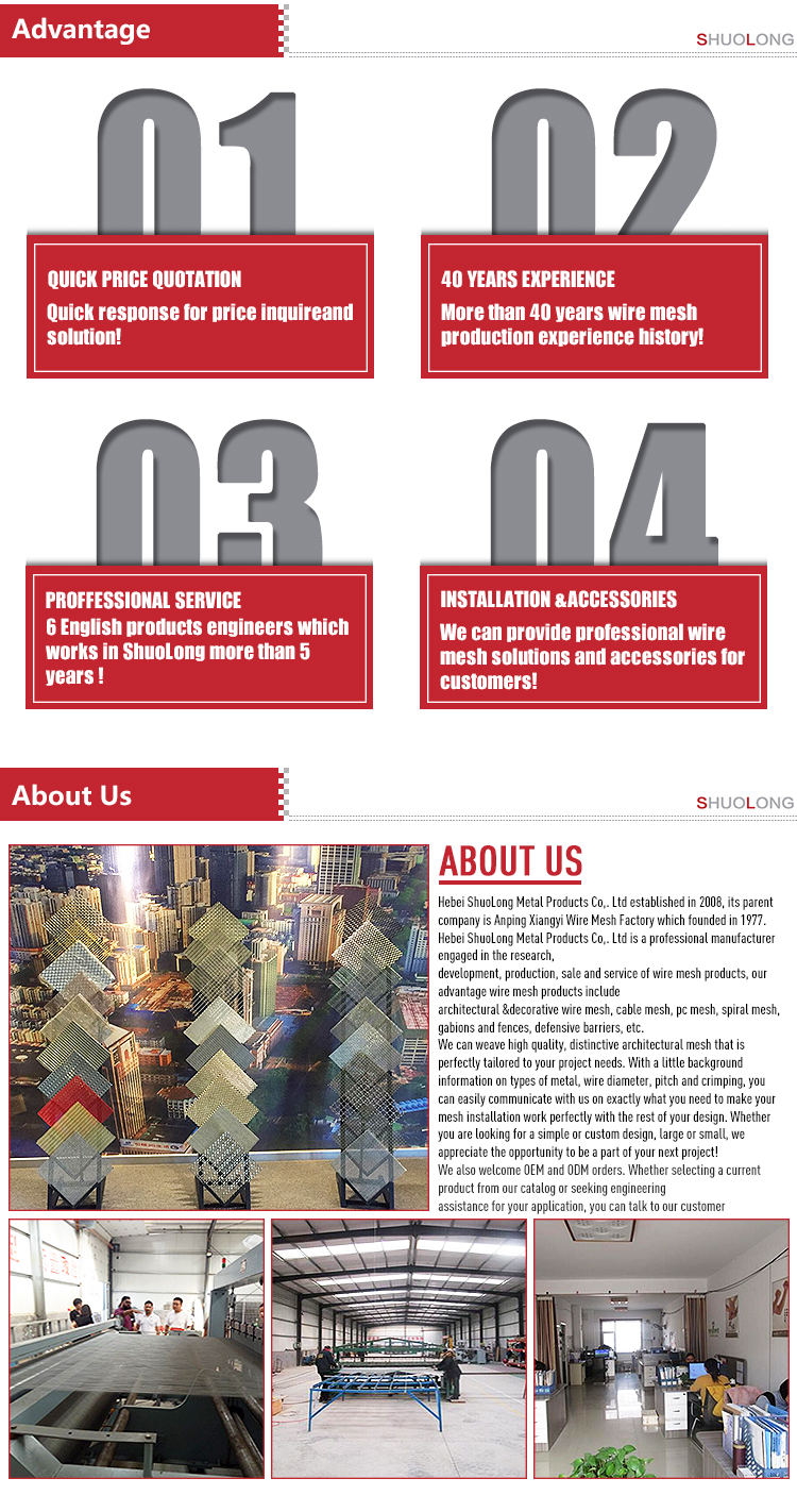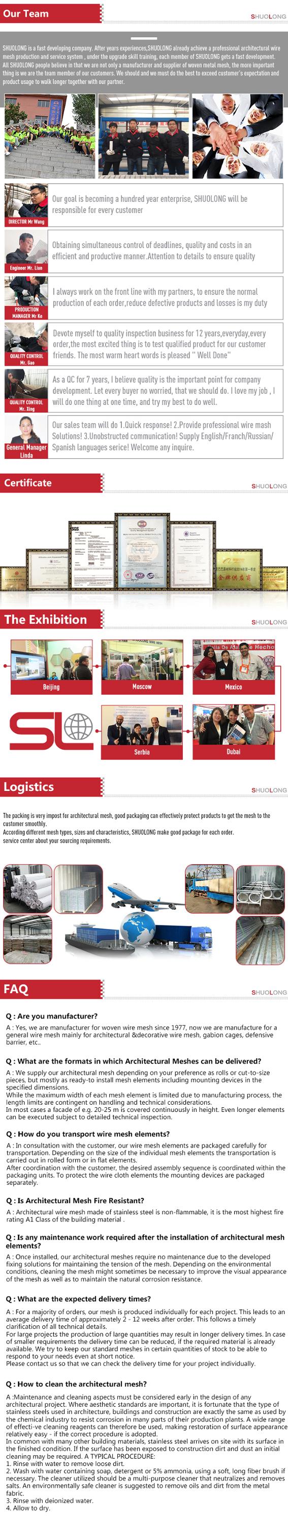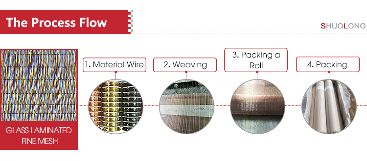 Most of the products manufactured by Shuolong Wire Mesh are in the state of dense finish. To better serve our customers, we have researched a variety of secondary finishes that are suitable for both interior and exterior architectural applications along with woven wire mesh. We can assist them in the early design stages by identifying suitable raw materials and establishing specifications that will produce the desired final finish.