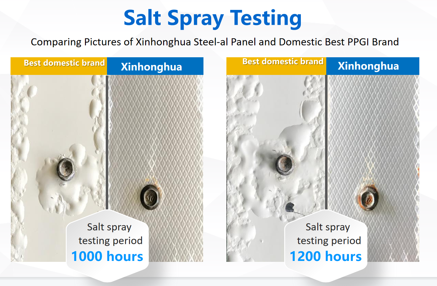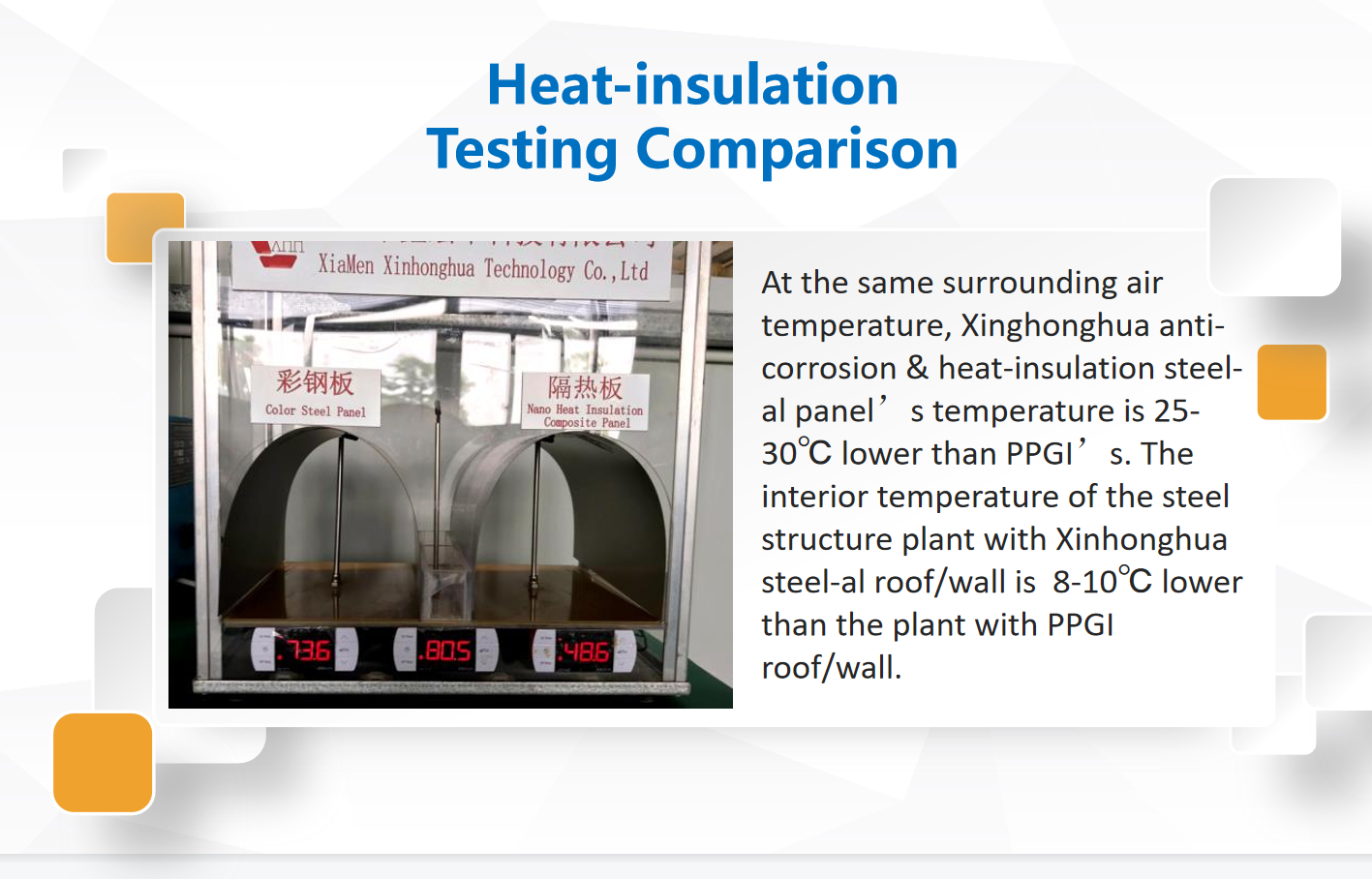Nano-PETXHH nano heat-insulating steel-aluminum composite panels use composite materials to protect the inner base steel plate. The nano-PET anti-aging film has a service life of more than ten years and plays a very good role in protecting the base steel plate. Tested in a salt spray environment for over 500 hours (equivalent to over 20 years of outdoor use under normal conditions), no peeling, rusting was found on our products.