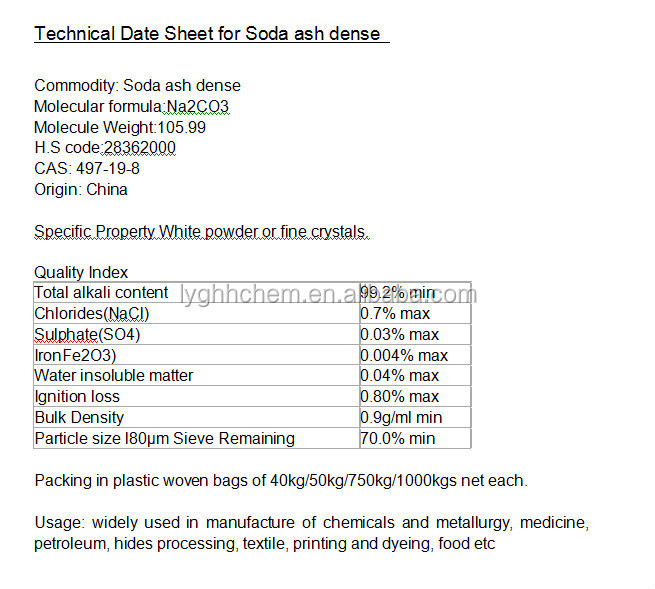 | usage: | Glass, metallurgy, detergent, paper making, dyestuff, petrochemical | IF: | Sodium carbonate |