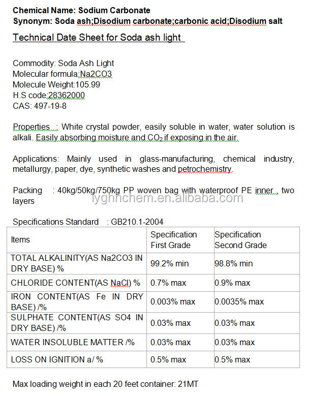 Product name soda ash National Chemical Catalog Number 207-838-8;231-867-5 Chemical Abstracts Service number 497-19-8 Customs code 2836200000 IF sodium carbonate purity More than 99.2% appearance white powder application Glass industry, food processing Package Dense packaging: 50KG bag,...... -