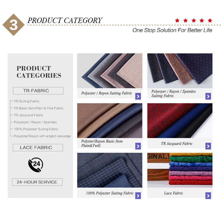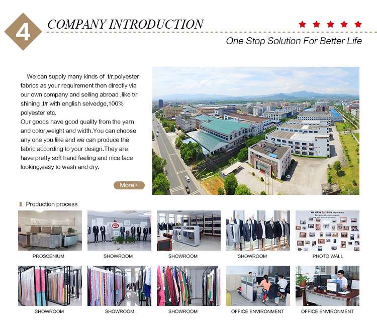 1. We specialize in the production of T/R, T/R/W, T/R/SP, polyester suit fabrics.