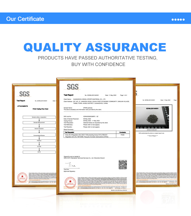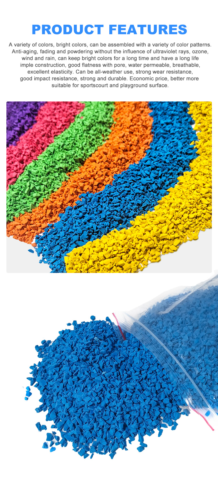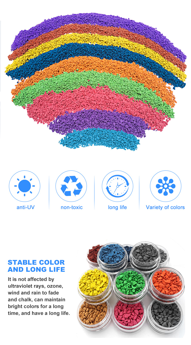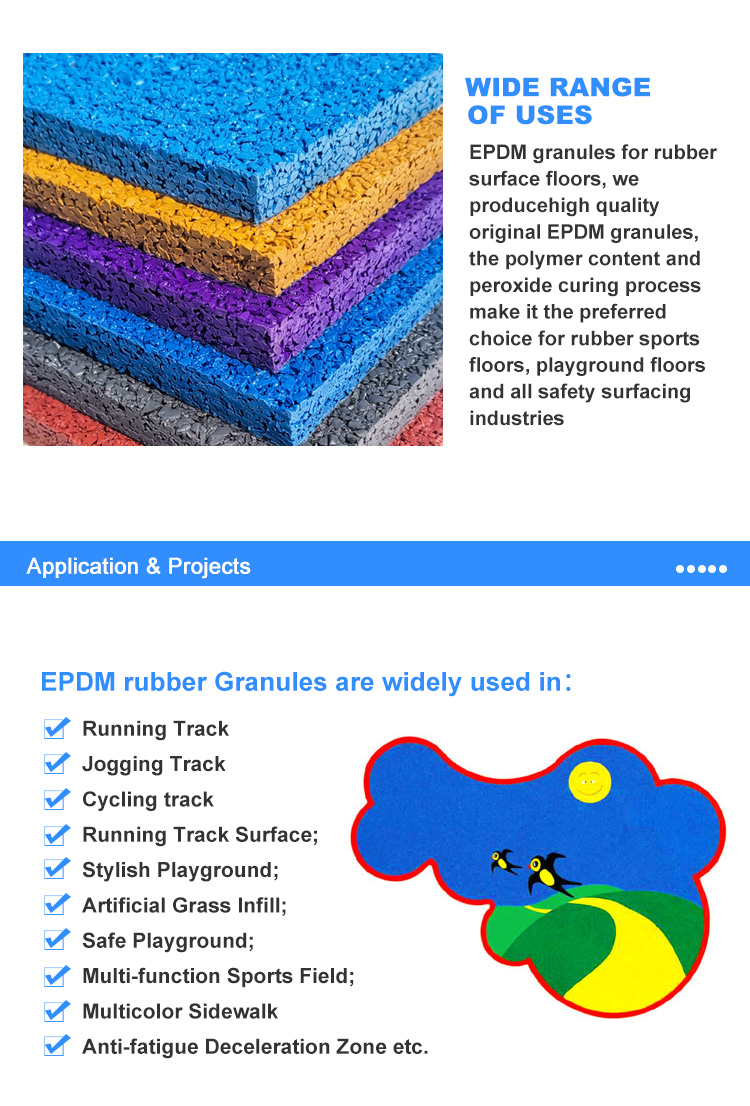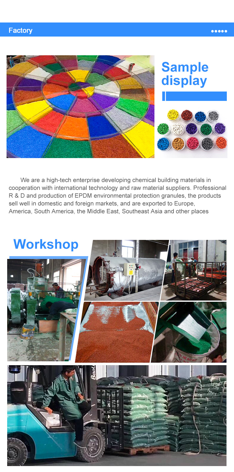 Certificate: lab exercise usage: Filling, paving, sports floors, children's playgrounds, raw materials, etc. feature: Environmental protection, durable, protective, anti-corrosion, non-toxic, etc. application: Sports fields, fitness centers, playgrounds, etc. Packaging Details: Packing Description.....