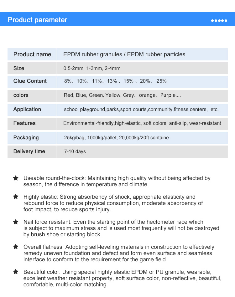 product name: Recycled Tire EPDM Rubber Granules type: EPDM Granular Outdoor Flooring Key words: Floor EPDM Rubber Granules color: green red yellow blue feature: environmentally friendly Origin: Hebei china size: 0.5-1mm.1-2mm.2-4mm.3-5mm brand: sissy application: children's playground Packaging...... -