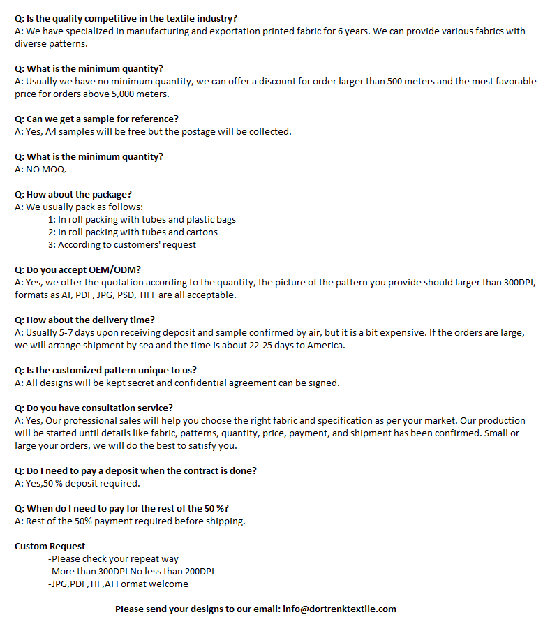 Dortrenk Textile is a digital printing company. We can print on almost any fabric such as cotton, linen, silk, polyester, poly-cotton, viscose. We can print our design, also can print customer's design. Furkan Offset is a group of companies including offset printing on paper and digital printing on fabric. Dortrenk is a subsidiary of Furkan OFSET.