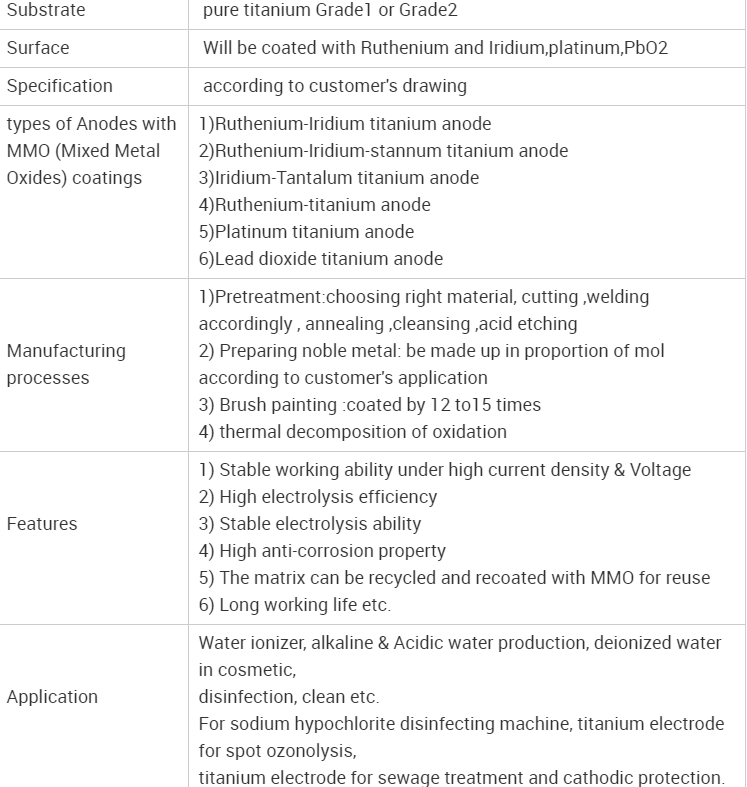 Metal oxide and metal mixture oxide coating (MMO coating) titanium anodes such as RuO2/IrO2 coating anodes, platinum-plated anodes. These anodes are used for cathodic protection. Titanium anode is also known as DSA (dimensional stable anode) anode or insoluble Ti anode because of its good dimensional stability and high corrosion resistance, which can prevent it from polluting the electrolyte and improve the purity of the final product.