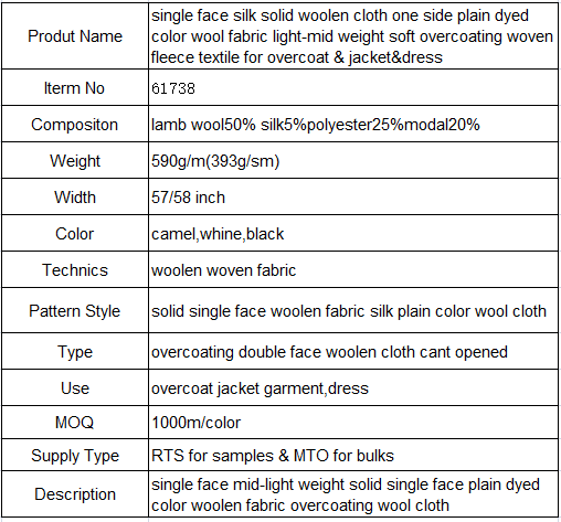 model: 11769 Package preview: Pattern style: Solid color double-sided woolen fabric For people: Ladies, Men, Girls, Boys Process: woolen cloth, woven cloth sample: free describe: Light-Medium Weight Solid Double Sided style: clearly Certification: ASTM work: Wool 74% Polyester 26% Material:...... -