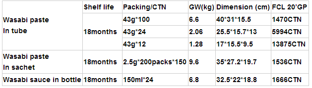 Weight (kg): 5G/3G form: paste Storage: cool Shelf life: 12 months, 12 months port: Qingdao/Shanghai Package weight: 5g/3g pack: Sachet Brix (%): 0 use: seasoning color: green Packaging Details: carton payment terms: wire transfer Certification: KOSHER, ISO, HACCP, QS, BRC Pack: Sachet Used for:...... -