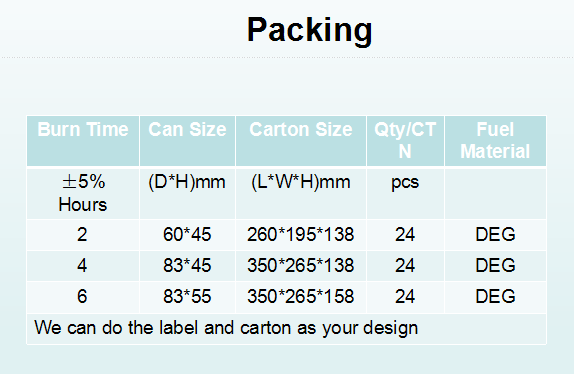 payment terms: Letter of credit, wire transfer, Western Union color: colorless Burning time: 2 hours 4 hours 6 hours application: hot pot Package preview: Certificate: ISO and REACH brand: Ozge Supply capacity: 100,000 boxes per month Contact us for latest prices Package: Carton Minimum order...... -