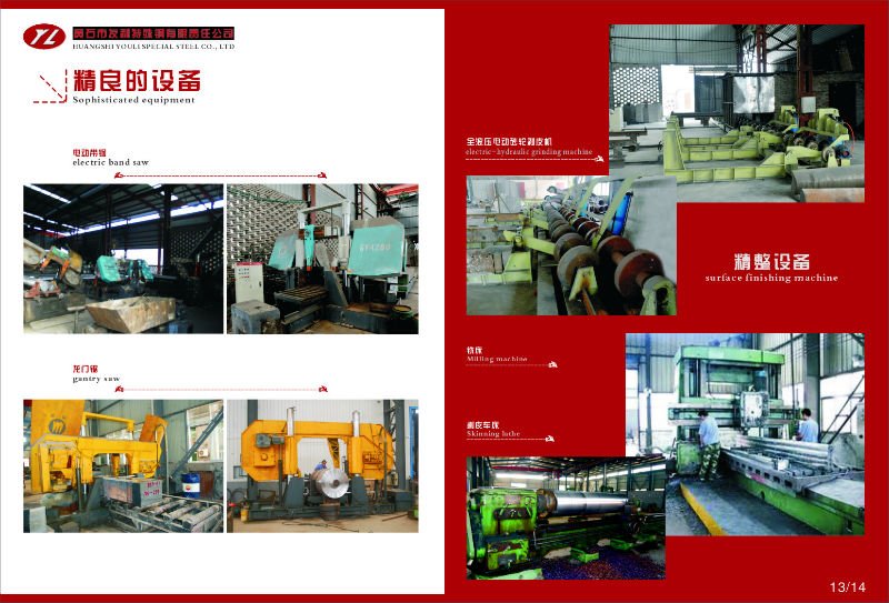 Smelting equipment: 3, 4 ton induction furnace; 10t electric arc furnace, refining furnace vacuum furnace, 0.3, 0.5t, 1t, 3t, 5t electroslag furnace, especially 3 ton, 5 ton electroslag furnace with single pole and double pole in series Features. Processing equipment: electro-hydraulic hammer; supporting equipment: gas furnace, heating furnace, gas annealing furnace, electric annealing furnace, electro-hydraulic grinder, electric band saw, gantry saw, etc.