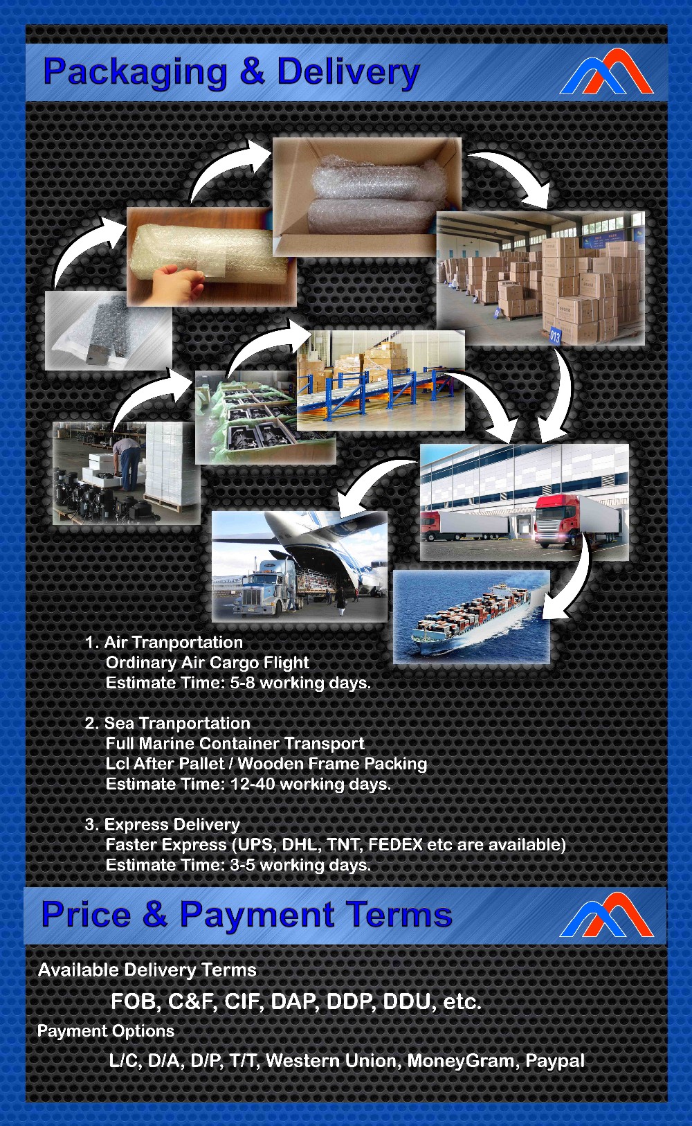 B: FOB Tianjin/Beijing, C&F, CIF, DAP, DDP, DDU, etc.