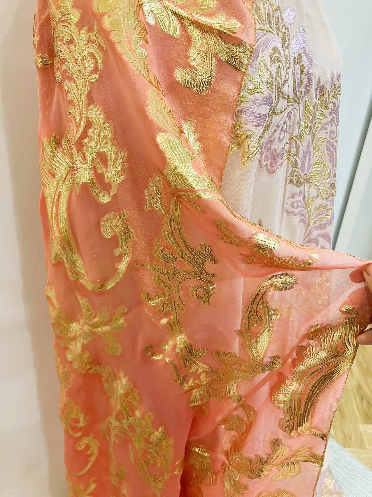 use: Wedding dresses, gowns, ready-to-wear product name: Hand-printed soft natural silk-jacquard velvet style: Jacquard Certification: ISO 105 Key words: Silk chiffon fabric supply type: Inventory Process: to weave Material: 100% silk sample: usable density: High design: buyer request Feel: super...... -
