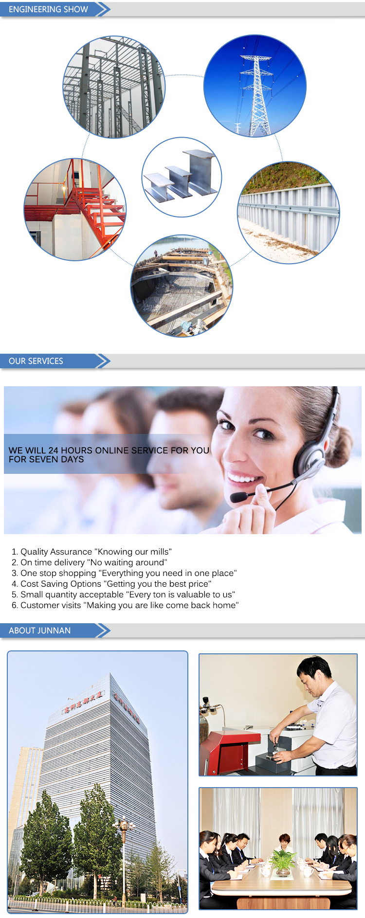 Tangshan Junnan Trading Co., Ltd. is located in Tangshan City, the largest steel manufacturing base in China, with a registered capital of 50 million yuan. It is a steel enterprise mainly engaged in domestic trade and international trade. The management has been in the steel industry for more than 20 years with rich experience in management team and established strong business relationship with our valuable customers and factories.