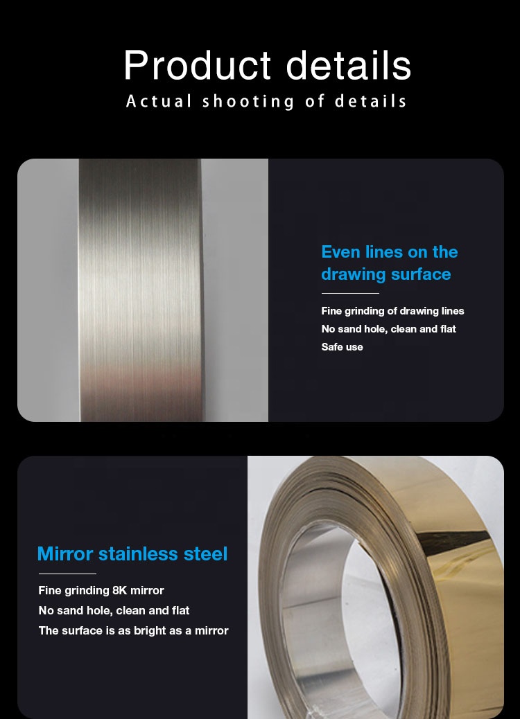 Finish: 2B/BA/HL/NO.4/8K/embossed/gold/rose gold/black gold Key words: stainless steel strip Advantage: Factory direct supply model: T-SS tape port: Shanghai or Tianjin Packaging details: Standard packaging is plastic bags and strapping, and can be customized; bundled with steel straps. End plastic.... -