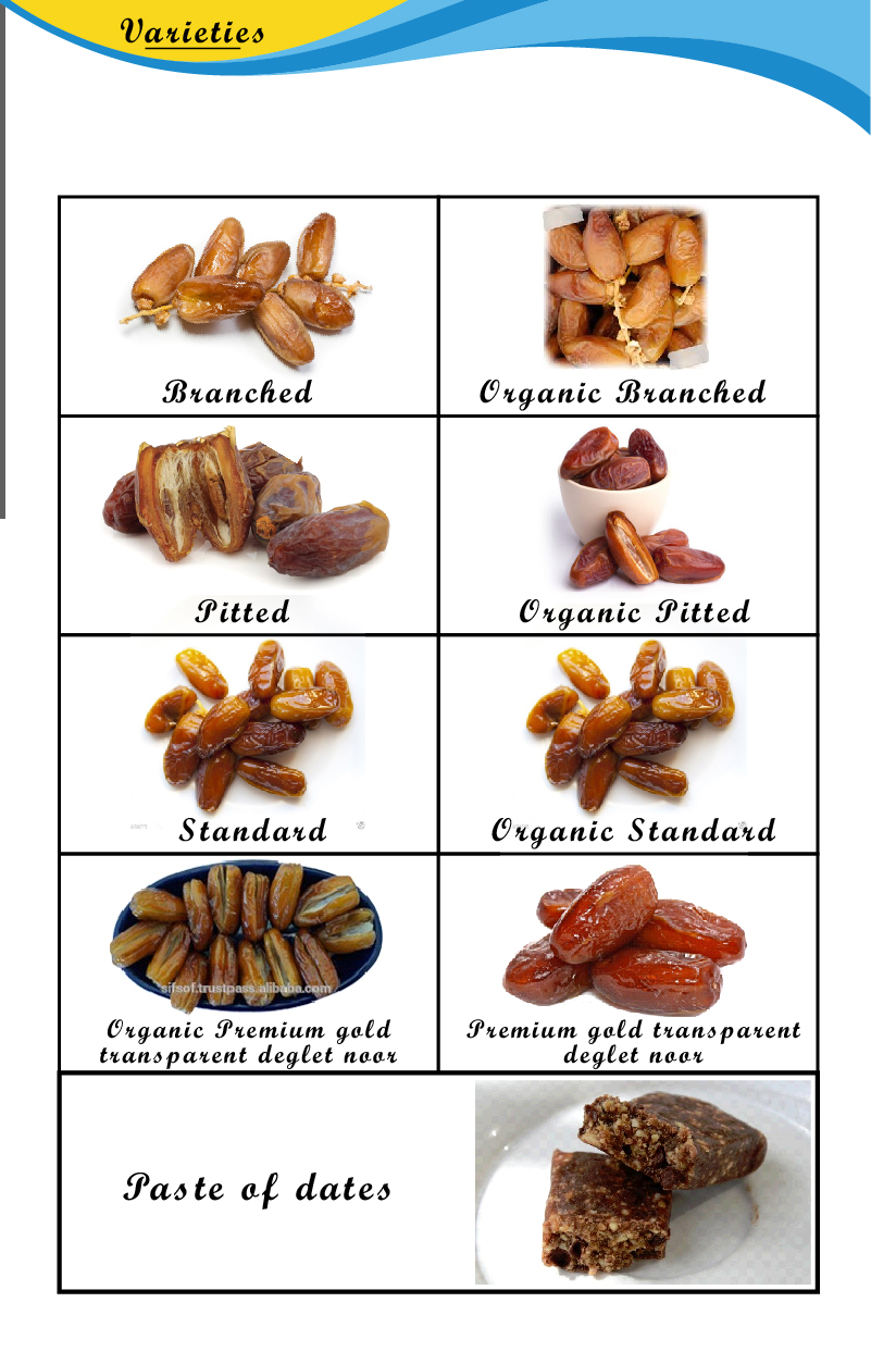 | Packaging Details: | Organic pitted dates. Tunisian Premium Dates "Deglet Noor" 250g Tray | category: | Deglet Noor or "Day of Light". translucent' |