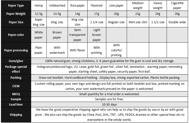 weight: 13-24gsm pack: Booklet/Bag, Box/Bulk payment terms: T/T, PayPal, Western Union brand: custom logo port: Shenzhen Port Packaging Details: 32 pages per volume, 40 boxes per carton model: smoking roll Origin: Guangxi, China Leaves: Level 32 / Level 50 / Level 60 Chewing gum/glue: 100% Natural..... -