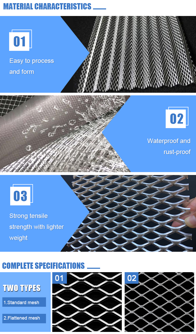 technology: welding product name: Aluminum Expanded Mesh Aluminum Rhombus Mesh feature: Corrosion resistance Packaging Details: Packed in cartons Packed with waterproof paper bundles Packed in trays Packed in tarpaulin rolls Packed in woven bags Origin: Hebei china Advantage: longevity Material:......
