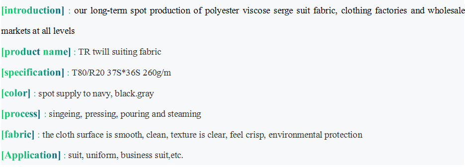 | product name: | T/R suit fabric | Material: | Rayon/Polyester |