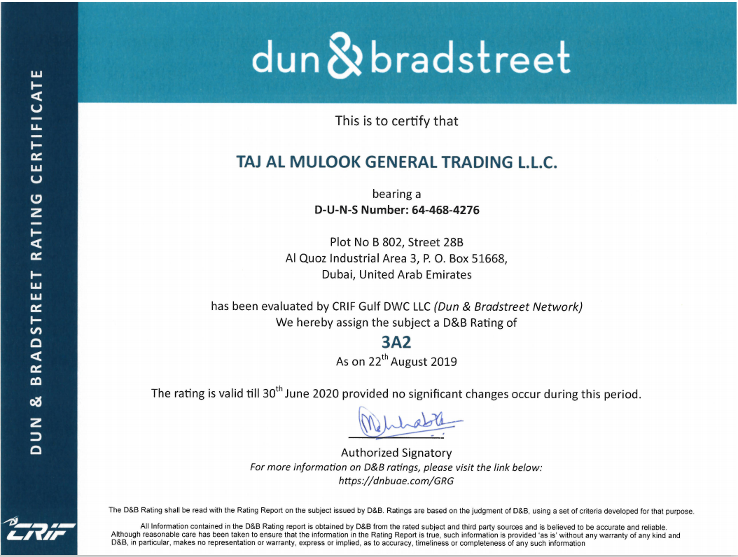 Taj Al Mulook General Trading LLC is a multinational organization operating for over 25 years. We are headquartered in Dubai with a subsidiary in Saudi Arabia. We are also ISO:9001 certified and have the highest credit ratings from Coface, Dun & Bradstreet. The company is led by an experienced Board of Directors leading a group of individuals with extensive knowledge and expertise in the field of chemical distribution.