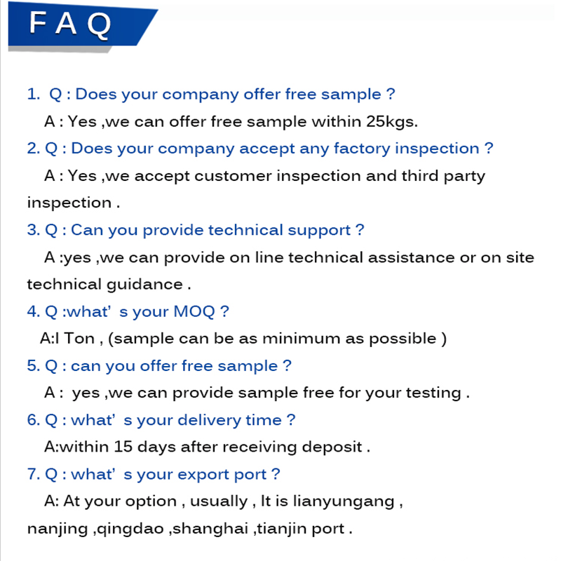 1. Packing: 25kg/bag, 1000kg/bag. 20-25 metric tons/1x20 container.