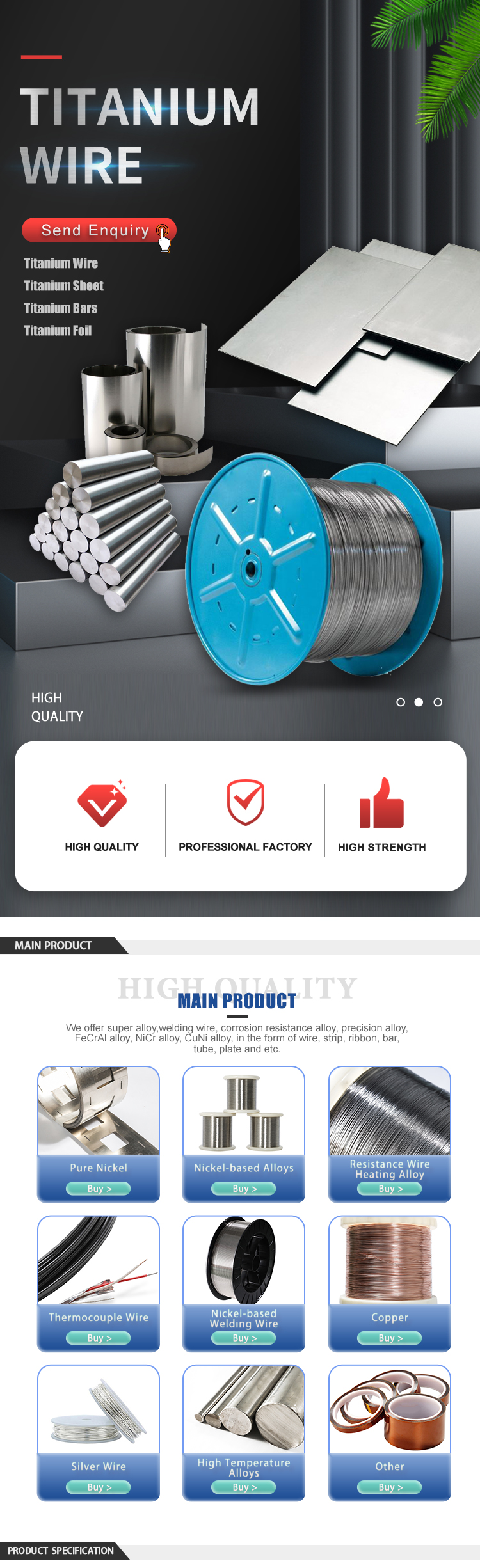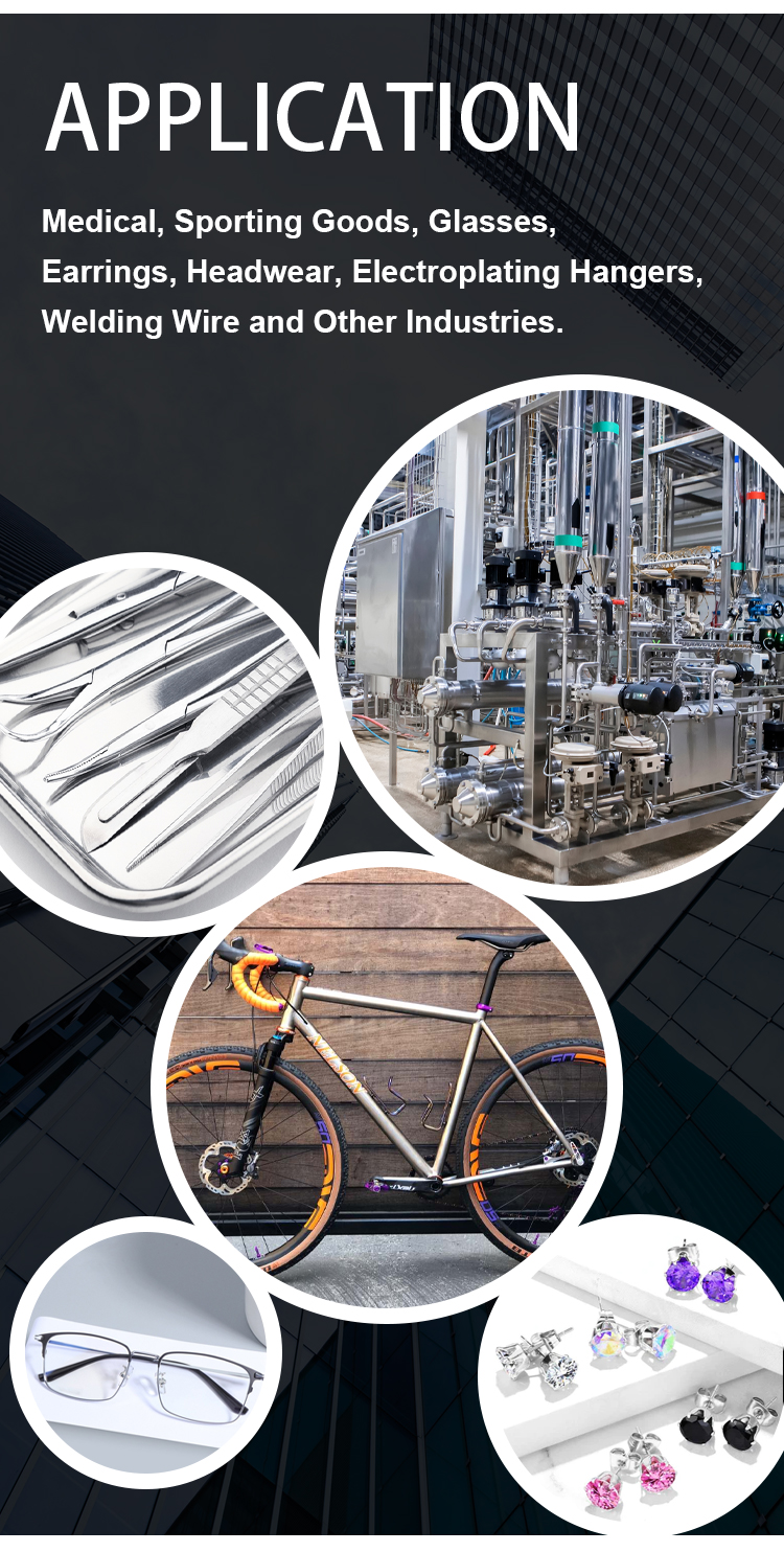 Specification * Application field of titanium wire:Medical, sporting goods, glasses, earrings, headgear, electroplating hangers, welding wire and other industries.