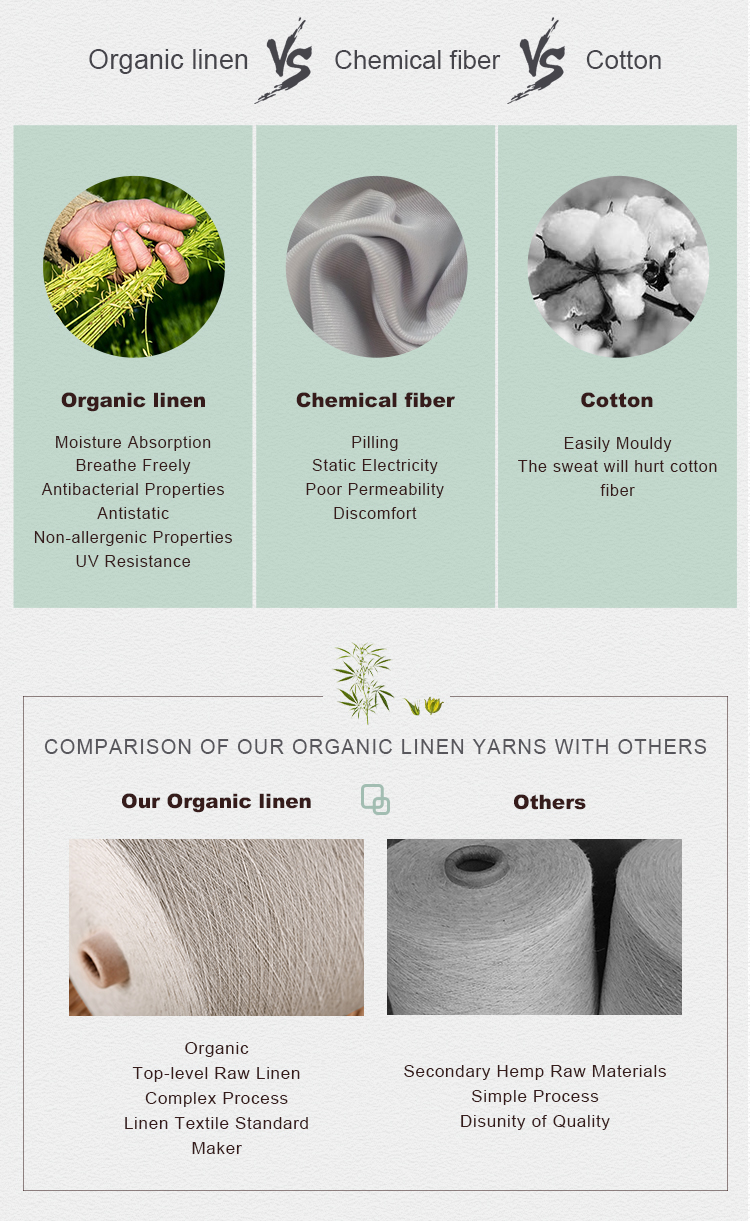 Our organic flax products have the advantages of good hygroscopicity, no static electricity, strong warmth retention, high tensile resistance, anti-corrosion and heat resistance, straight and clean fibers, and softness.