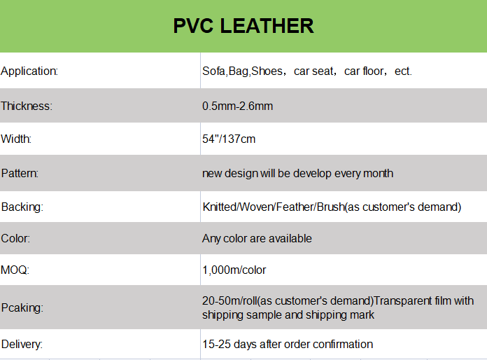 port: Shanghai/Ningbo/Huangpu Environmental Standards: 7P, up to, lead-free thickness: 0.8-1.5mm Material: PVC leather pattern: Embossed pack: 30-40M/roll, each roll is equipped with a strong polyester bag Origin: Jiangsu, China Backing Technology: non-woven fabric feature: Waterproof, elastic,...... -
