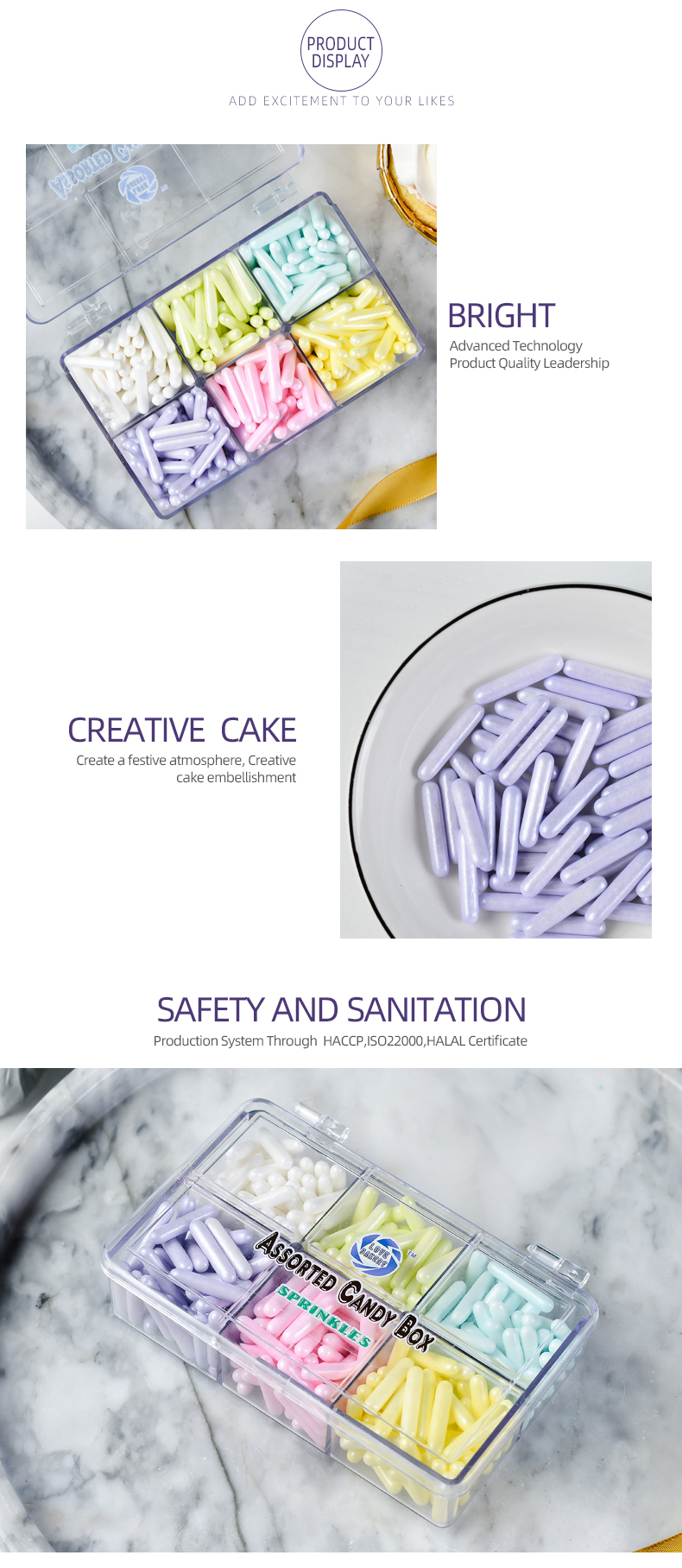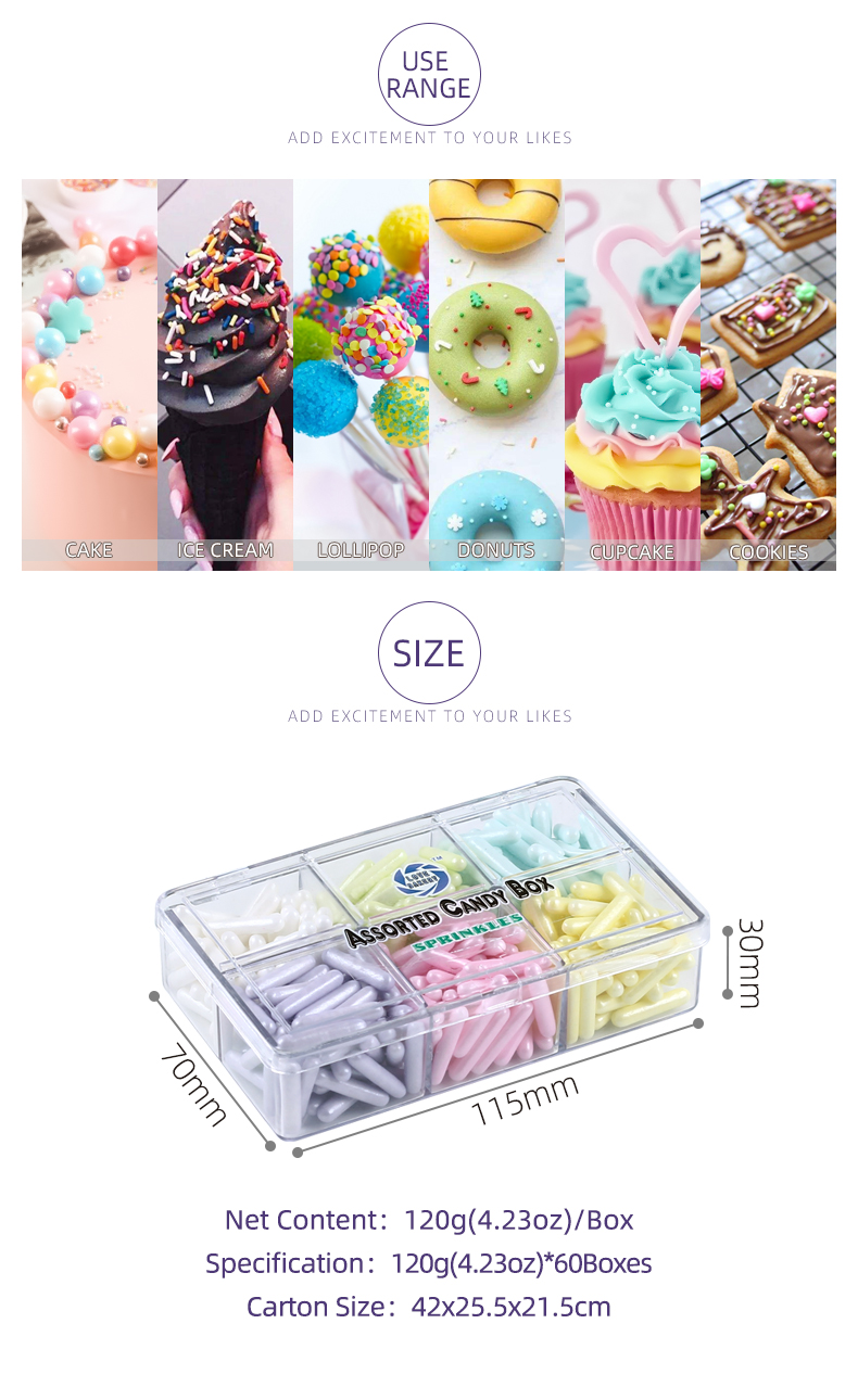 | Marshmallow 40g | 4mm sugar beads 50g | 2mm best 130g | 6 grid sprinkles 170g |
