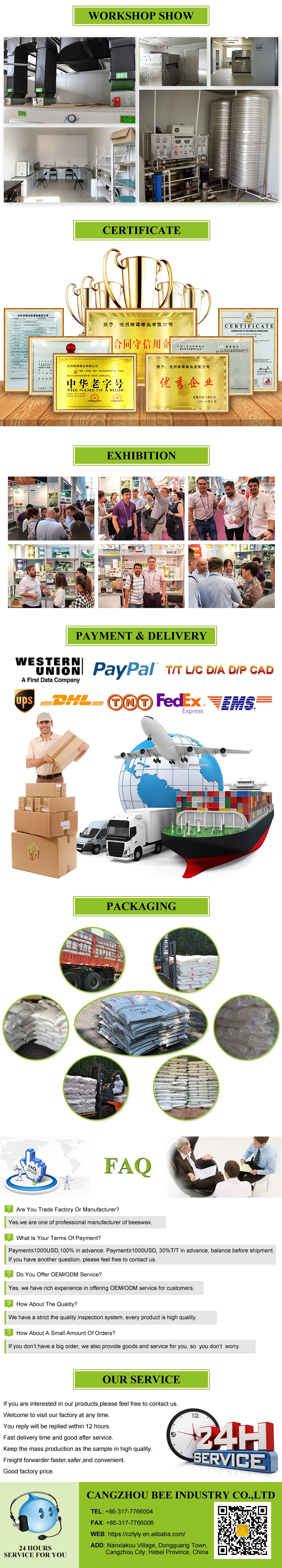Cangzhou Bee Industry Co., Ltd. provides all kinds of high-quality beeswax for customers with the corporate purpose of "quality creates value, integrity shapes the future" and the business philosophy of "integrity, quality, innovation, and service".