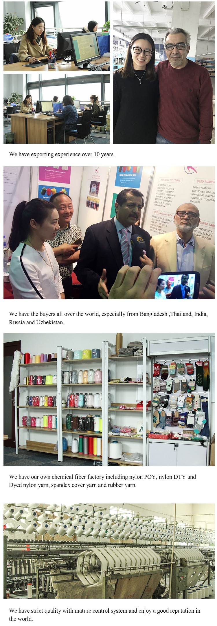 Material: Spandex/polyester payment terms: L/C, D/P, D/A, T/T Daniel: 75D Key words: elastic air covered yarn application: golf socks style: other brand: Lions use: knitting, woven Yarn count: 36th floor port: Ningbo/Shanghai twist: S/Z quality: Grade AA Evenness: AAA Name: strange Advantage:...... -