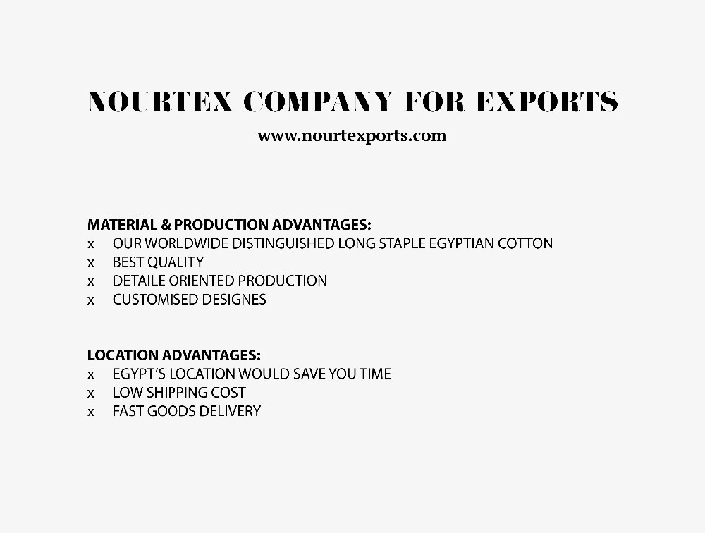 Nourtex Export Company was established after intensive research on the local and global market for premium fabrics and textiles. The young spirit of the company is very passionate about manufacturing, producing, exporting and supplying100% Egyptian CottonOffers bedding, pillows, towels, bathrobe comforters and duvet covers in a variety of shapes, sizes and high-end quality products.