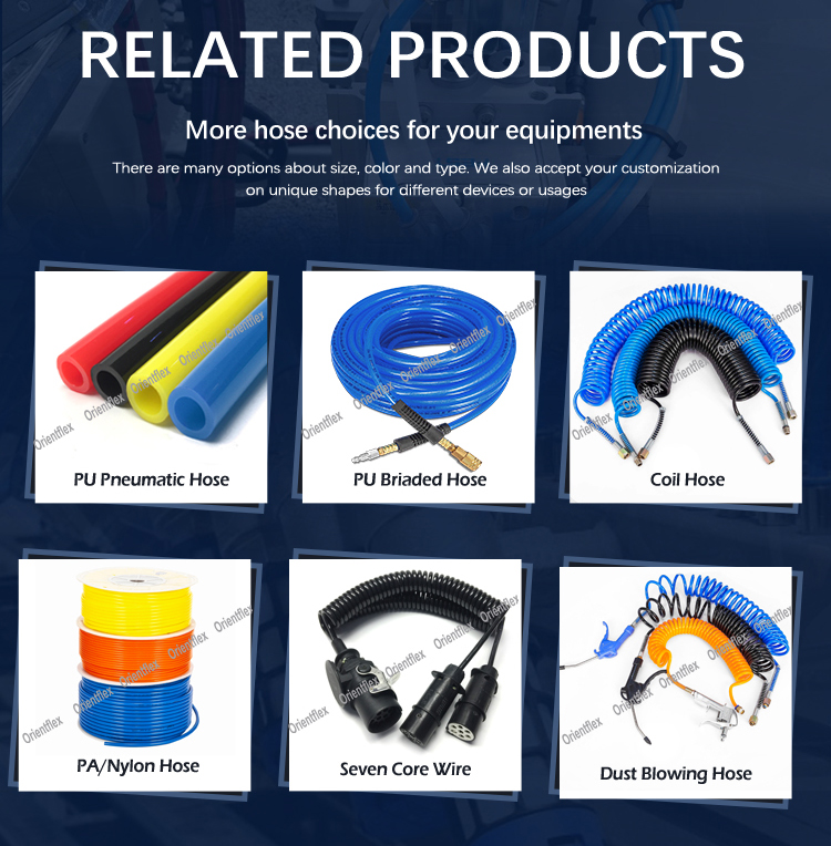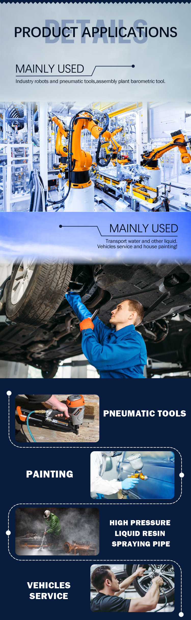 Flexible PU hoses are used in industrial robots and pneumatic tools, pneumatic tools in assembly plants, and pressure piping.