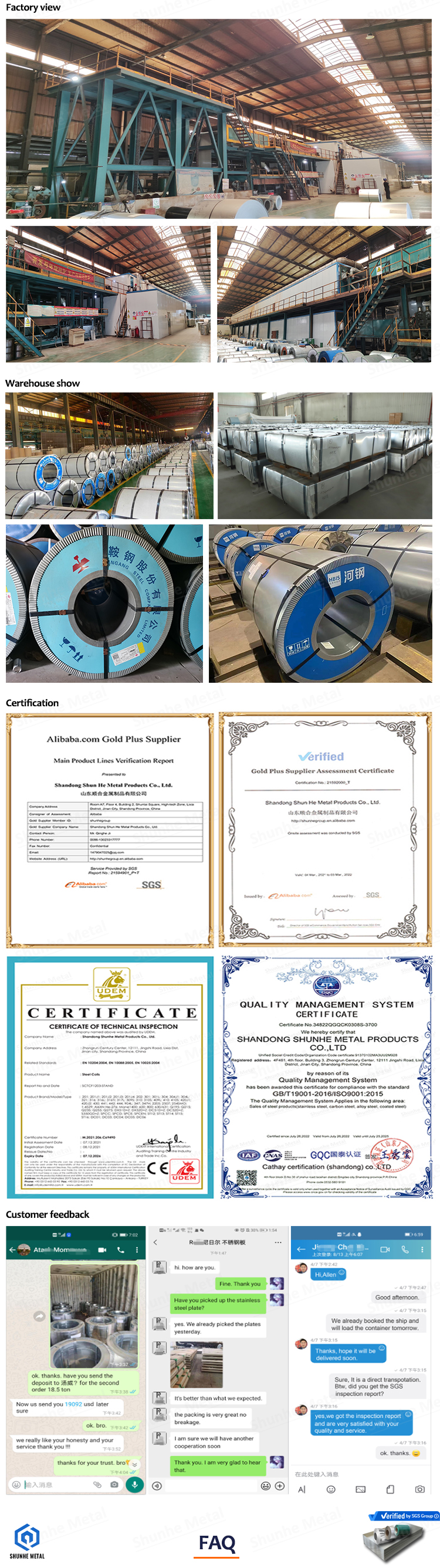 Shandong Shunhe Metal Products Co., Ltd. It is a company integrating industry and trade. our warehouseThe stainless steel warehouse is located in Wuxi City, Jiangsu Province, and the galvanized or galvanized steel warehouse is located inBinzhou City, Shandong ProvinceThe sales department is located in Jinan City, Shandong Province. Our main productsIs stainless steel sheet/sheet/coil/pipe/strip, galvanizedor galvalume steel plate/coil/strip/pipe,ppgi or ppgl,Ripple gi/gl orppgi ppgl Sheet, hot-rolled coil.Currently our products are sold at least in Uzbekistan, Russia, Korea, Philippines, Vietnam, Malaysia, Indonesia, United Arab Emirates, Serbia, Greece,There are 20-25 majors in Kenya, Canada, the United States, Mexico, etc.Sales staff who can process your order quicklyHelp you professionally solve international trade problems. Samples can be provided for free before mass production, we alsoAccept third-party inspection. Our management has more than 10 years of experienceIn the steel industry, if you areLook for steel products of Rizhao Steel, Shougang, Angang and other famous brands, we can also supply for you.Welcome to visit us, win-win cooperation! |