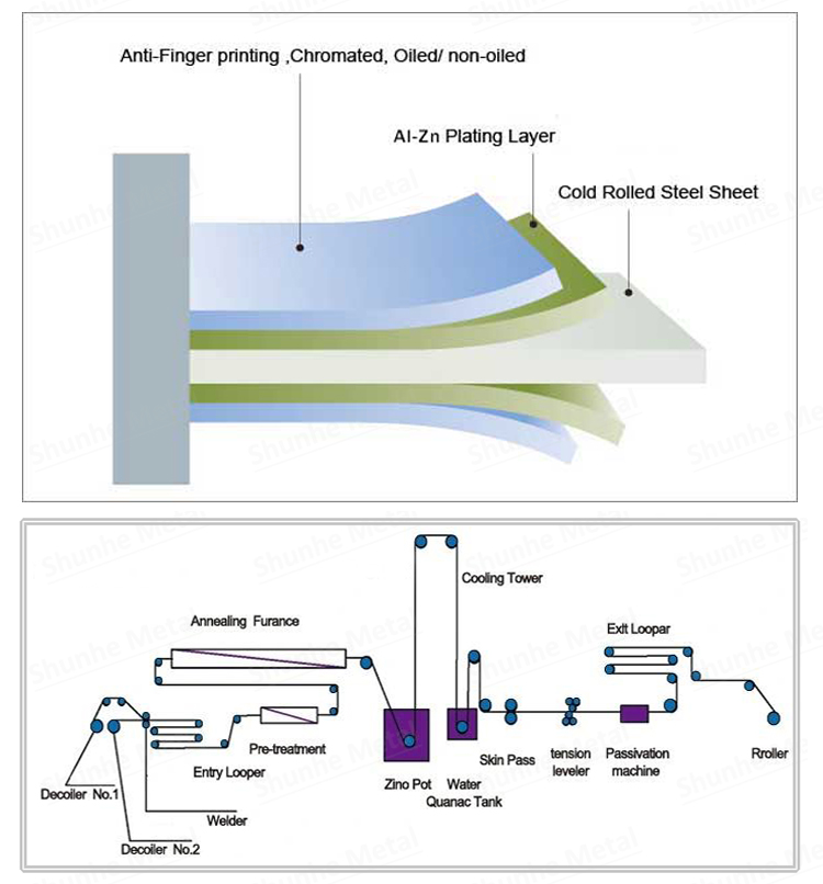 Hot-dip Galvalume steel is carbon steel coated with an aluminum-zinc alloy using a continuous hot-dip process, combining the corrosion and high temperature resistance of aluminum with the formability and protection of zinc. The coating composition consisted of 55% aluminum, 43.4% zinc and 1.6% silicon, respectively, by weight. |